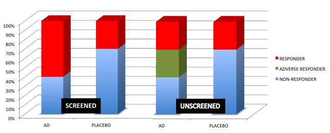 Note that when adverse responders are screened out, the ratio of responders to non-responders increases for antidepressants, but not placebos. Adverse responders who remain in clinical trials decrease the percentage of antidepressant responders relative to those who don't respond. Matching antidepressants to patients using personalized treatment methods increases the number of those who receive the right treatment and therefore respond at higher rates.