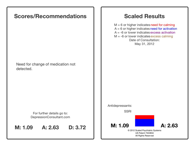 April 11, 2012 Jane is a 62 year old married woman who was referred by her primary care physician six months ago for evaluation of depression. She had presented a history of prior treatment with sertraline (Zoloft) but didn't think she needed it again at that time. Today she presents with significantly increased sadness, anxiety and fatigue, which she attributes to increased financial stress. The Clinaptica Depression Consultant app (Figure 1)finds a moderate level of depression (D=24.19) with a need for both calming (M=11.19) and activation (A=13.00) and recommends SNRI or SSRI+NDRI treatment. We elect to start her back on her previous SSRI at 50mg daily and see how she does.